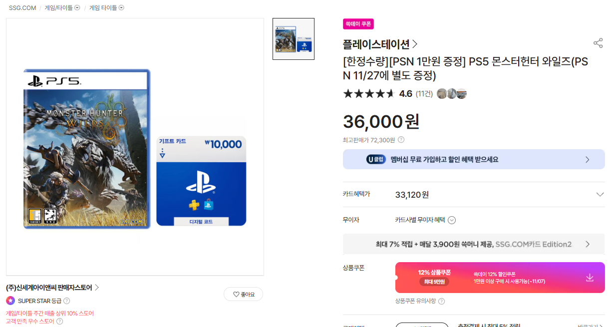 [SSG.COM] PS5 몬스터헌터 와일즈 (36,000원/무료) 부끄꼼 0 112 0 11.07 13:32 랜덤 쓱데이 쿠폰 적용하고, PSN 1만원 기프트카드 받는거까지 감안하면21,680원까지 나오네요.역대가라고 보여지네요. 관련 링크 https://www.ssg.com/item/itemView.ssg?itemId=1000631180124&siteNo=6004&salestrNo=6005&tlid… 0 #몬스터헌터와일즈