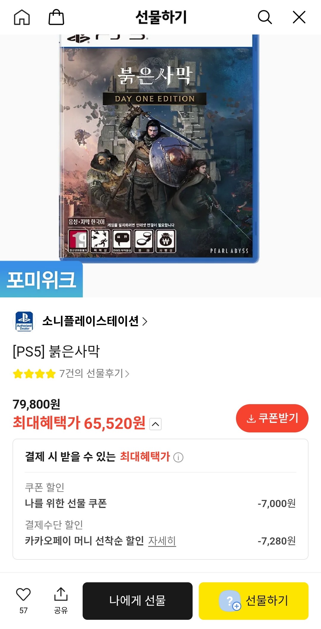 [카카오 선물하기] PS5 붉은사막 (65,520원/무료) 1 꿀맛세상 1 41 1 04.16 09:48 랜덤 카카오톡 쇼핑에서 붉은사막 검색하면 뜹니다.쿠폰 받아서 적용하고 카카오페이 머니로 결제하면 65,520원달달합니다 ㅎㅎㅎㅎㅎ 1 #붉은사막 태그 관련글 +1 04.16 [핫딜] [카카오 선물하기] PS5 붉은사막 (65,520원/무료) 04.14 [이벤트함] 4차 게임함이벤트 - 붉은사막(PC용) +2 04.03 [게임 통합게시판] 붉은사막 접은 후기 04.01 [게임 통합게시판] 붉은사막 전세계 400만장 돌파 04.01 [게임 트레일러] 붉은사막 공식 출시 트레일러 (한국어 더빙)